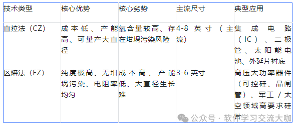 三、单晶硅生长主流技术:直拉法(CZ)与区熔法(FZ)的 “分工”