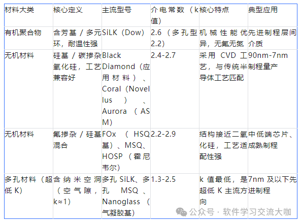 low-K 材料主要分为有机、无机、多孔三大类,每类都有主流代表型号,各自的优势和应用场景截然不同,一张表格看懂: