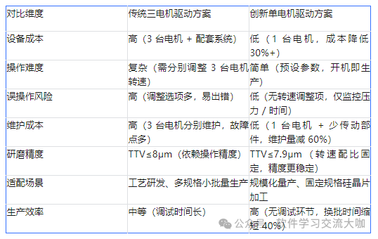用 1 台电机替代传统 3 台电机,既保证研磨精度(TTV≤7.9μm),又让设备成本大降、操作简化、