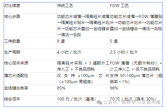 划重点:FOW 工艺的核心优势是 “减法思维”—— 减掉隔离硅片这个 “累赘”,