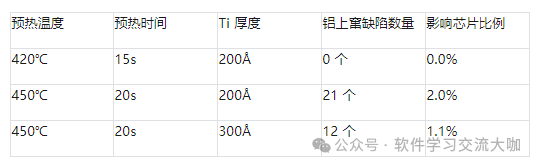 结论:预热温度>450℃、Ti 厚度<200Å 时,缺陷频发;降低温度 + 增厚 Ti 层,可显著减少缺陷!