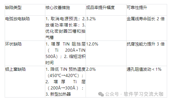 实操案例:某厂采用新型加热器 + 增厚 Ti 层后,铝上窜缺陷率从 2.0% 降至 0.1%,通孔阻值稳定性提升 95%!