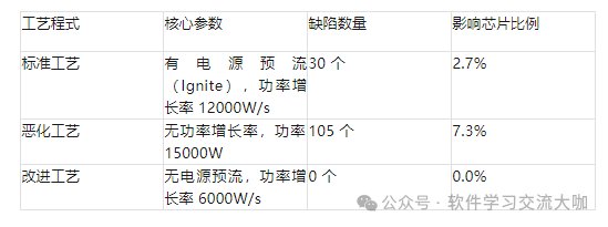 工艺优化:删除电源预流环节,将功率增长率从 12000W/s 降至 6000W/s,避免功率过冲;