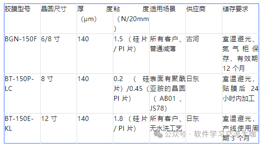 减薄工艺:普通硅片选 BGN-150F,PI 表面硅片选 BT-150P-LC,12 寸选 BT-150E-KL;