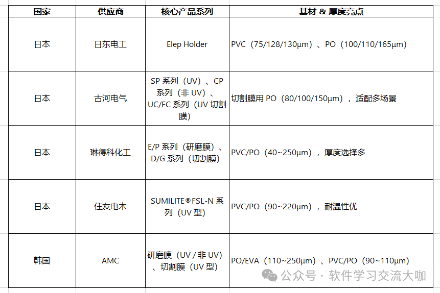 1. 研磨膜+切割膜主流供应商(日企为主,性价比+品质双在线)